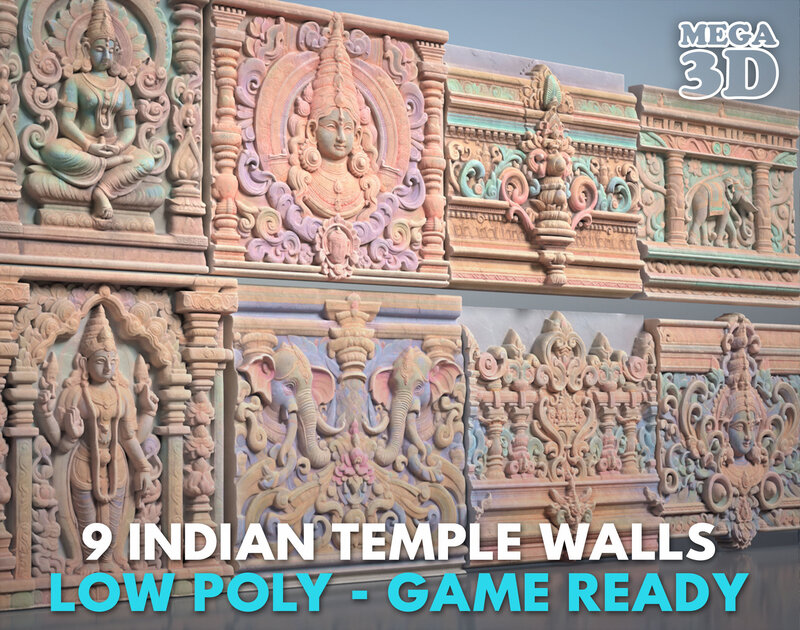 This product consists of 9 3D models of Indian Temple Walls. These models are decorated with patterns and characters, following the ancient Indian style. You can use them to enhance the liveliness of your project.