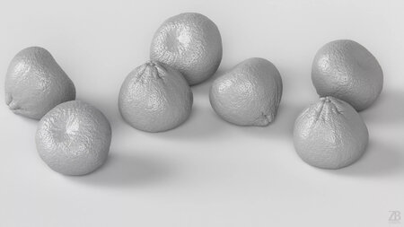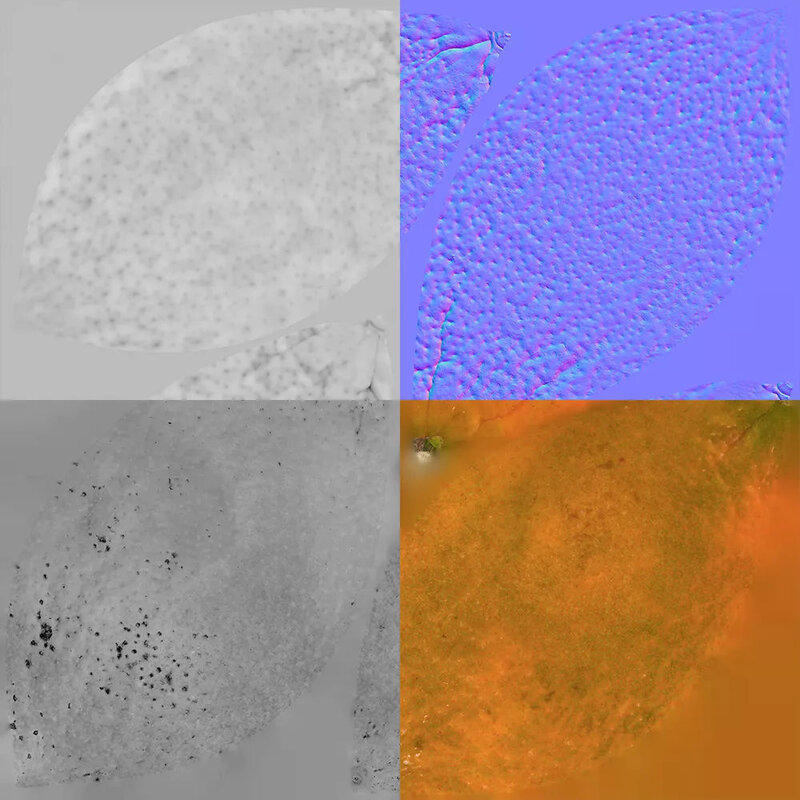 5 maps are supplied with this model. Textures supplied are in JPG format and are in 2K, 4K, and 8K resolution. The texture maps include diffuse, glossiness, roughness, normal, and displacement(tif). The clementine model is uvw unwrapped. 16K diffuse included.