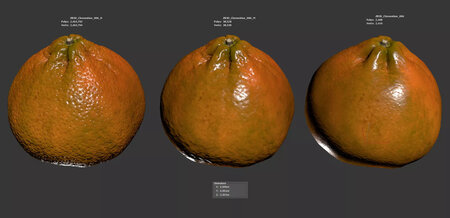 The clementine model is presented as a single mesh in 3 subdivision levels: low, mid, and high. Meshes are quad-based. The polycounts are 2K, 38K, and 2465K. The high-detail model is included in .max, .fbx, and .obj formats.