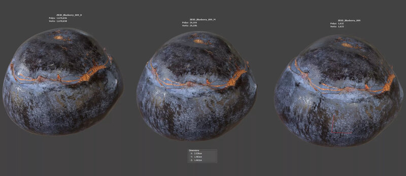 Enhance your visualizations, product designs, or still-life projects with this ultra-realistic 3D blueberry model. Meticulously photogrammetry scanned and textured, it boasts multiple levels of detail (1K, 26K, 1670K polycounts) for close-ups and broader scenes.