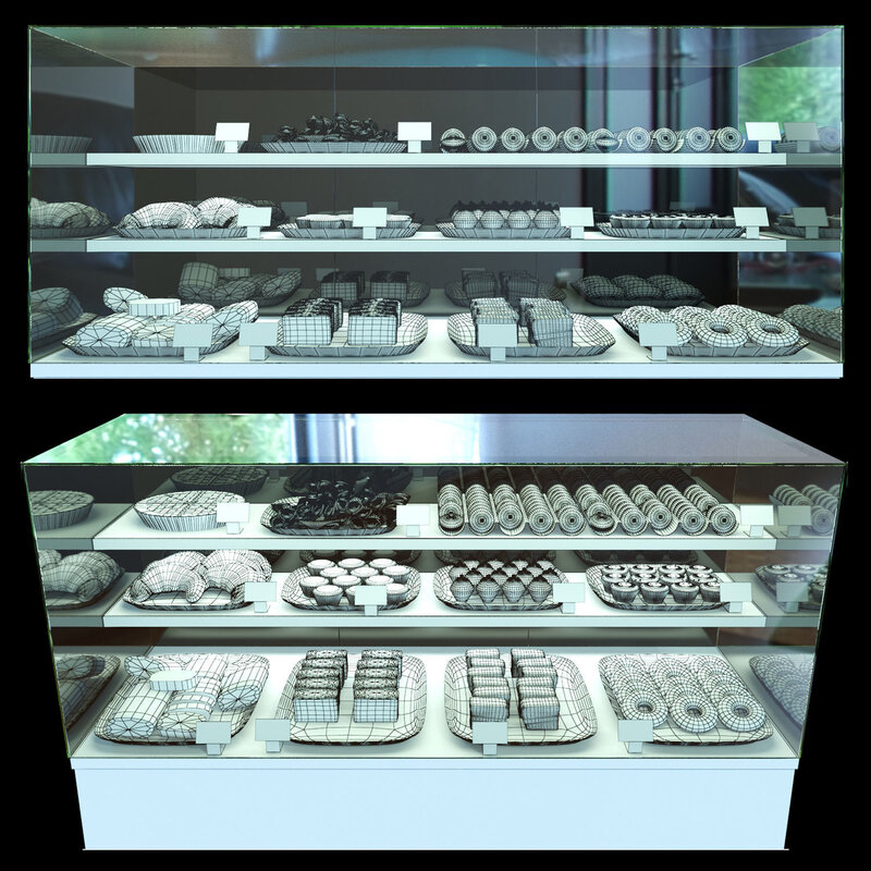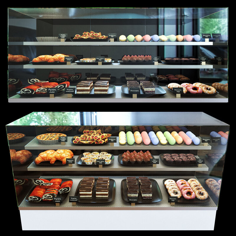 Cake set bakery display case with donuts and pastries 3D model